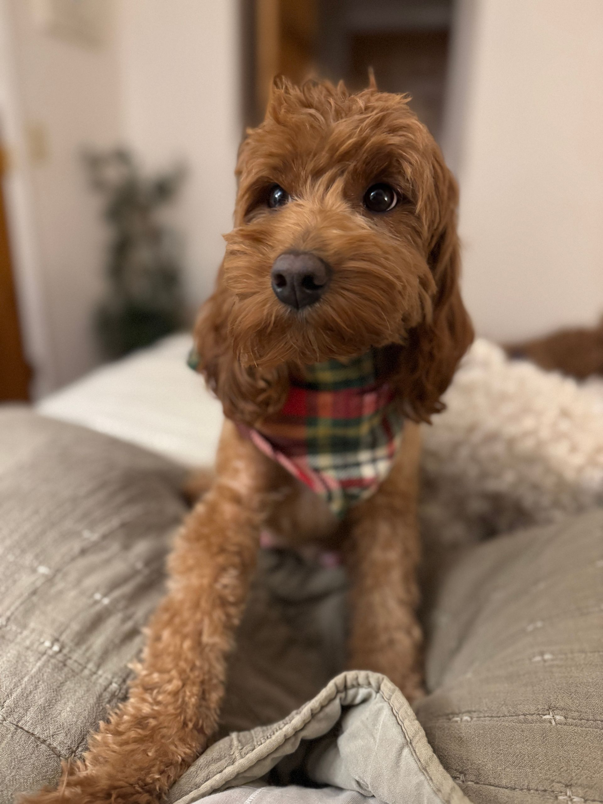 Nori is our first mini goldendoodle momma that started our petite program. She boasts everything desirable about the breed and you couldn't ask for a better tempered, more tolerable, sweet girl! Topping the charts at 17lbs, she has a deep red wavy coat that gives her the perfect teddy bear appearance.
